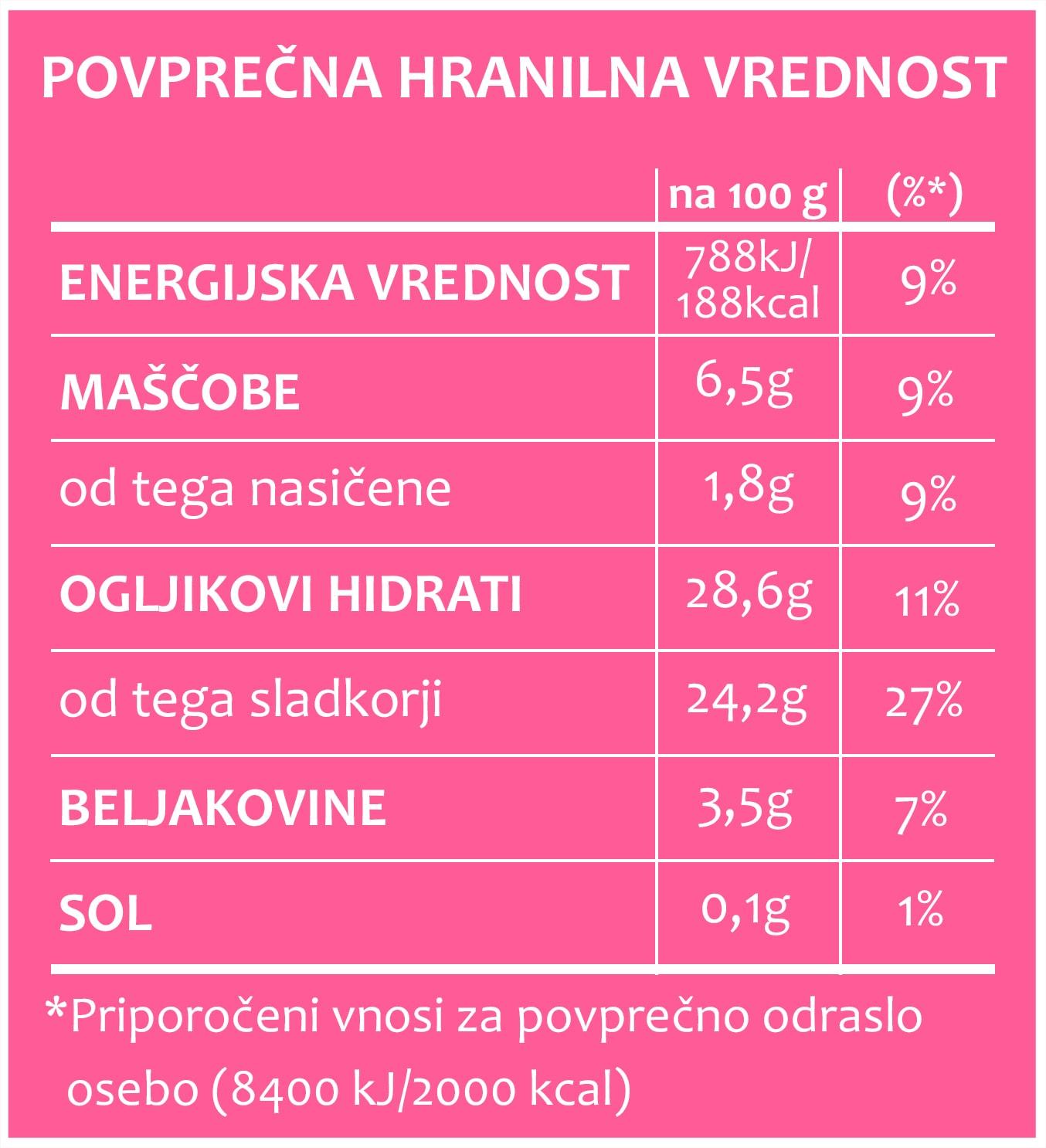Vsebuje: mleko, mleko v prahu, maslo, dekstroza, sladkor, emulgator: E471, škrob, gostilo: tara gumi, natrijev alginat, guar gumi, arome, barvilo (azorubine), kisline, citronska kislina, pokalice, glukozni sirup, jabolčna kislina, antioksidant, extrat rožmarina, ogljikov dioksid, koncetrat maline v prahu, kokosovo maslo, sojin lecitin.